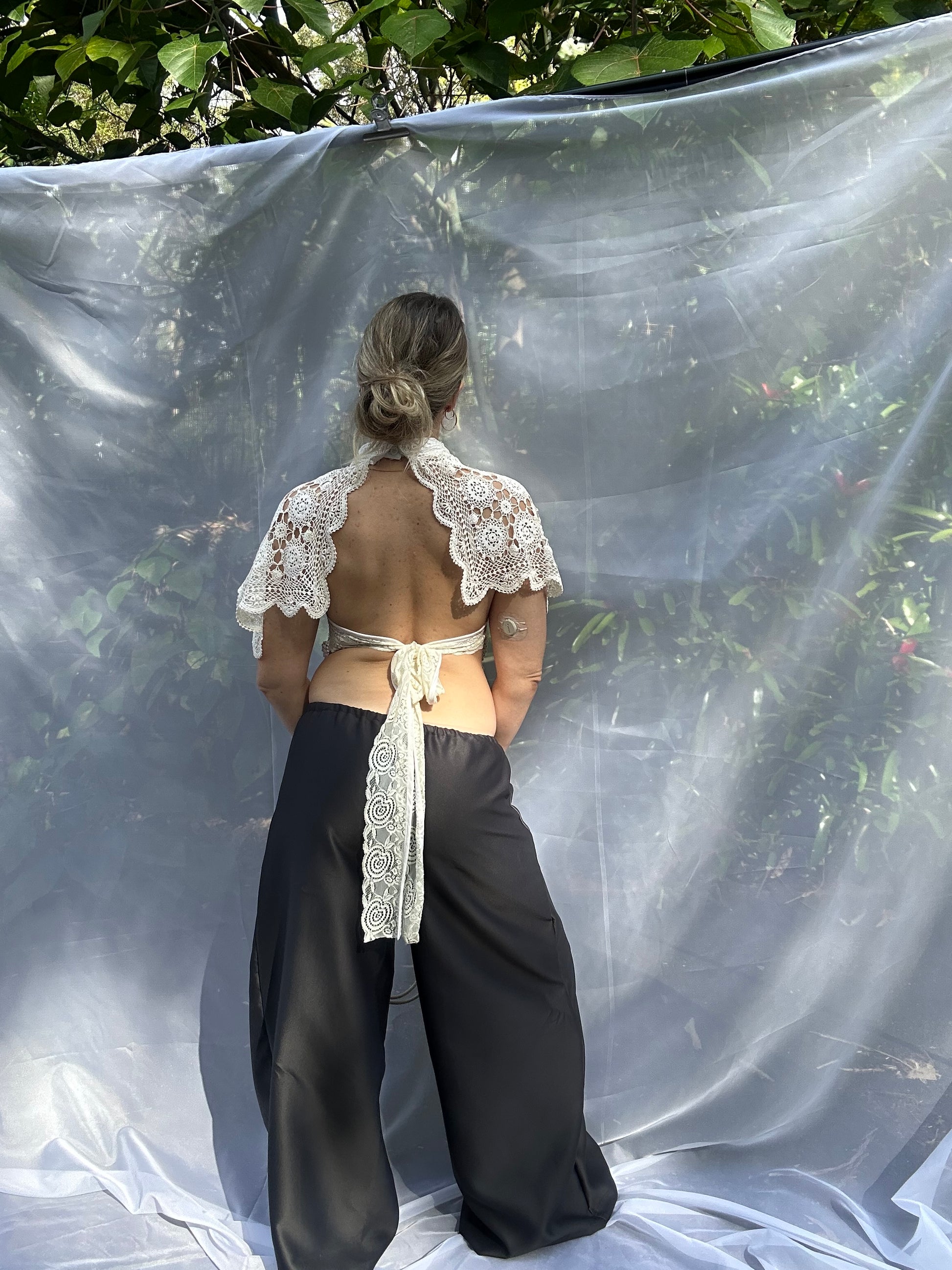 Upcycled lace doiley top, button neck collar and lace ribbon ties around the waist