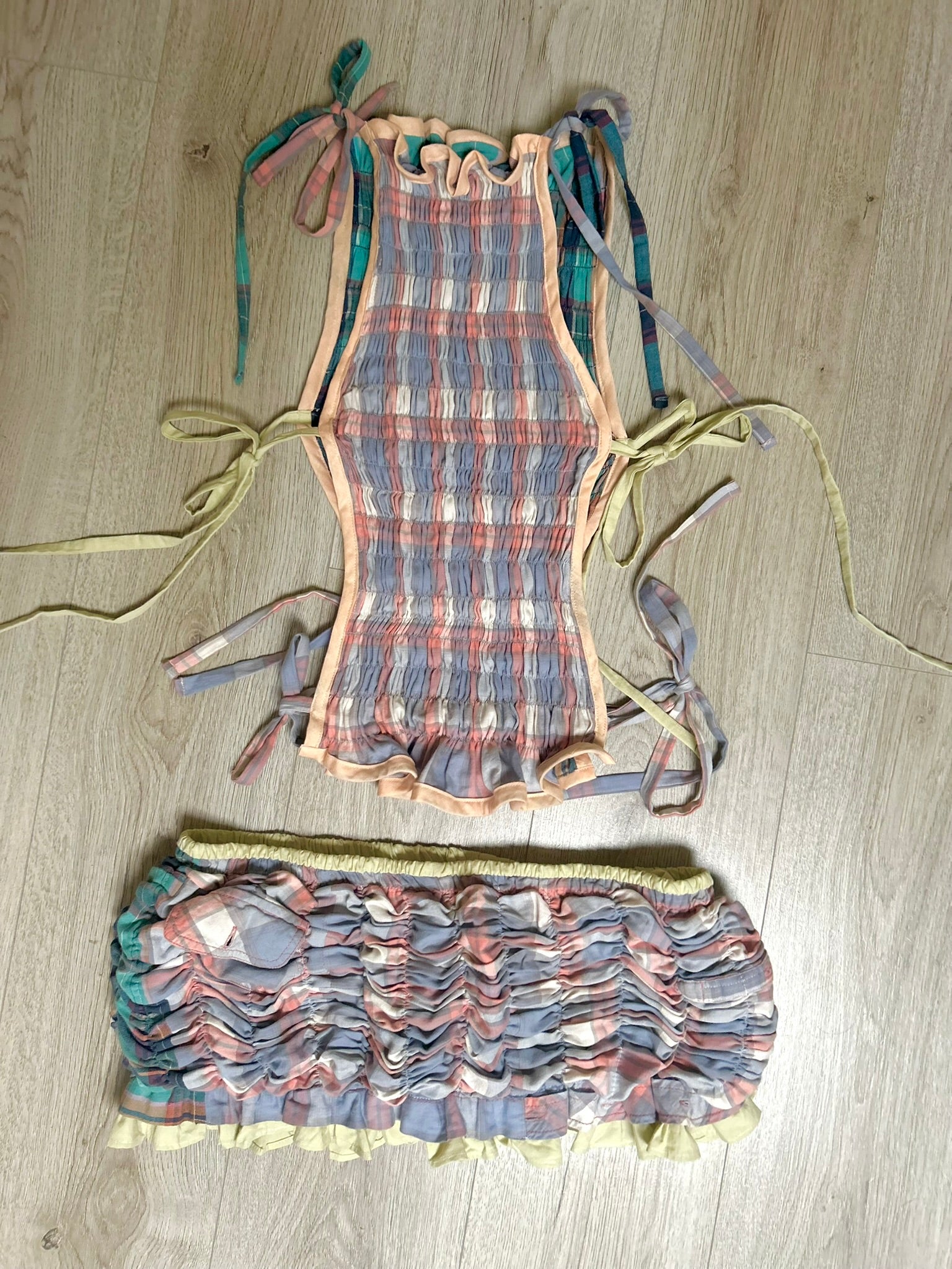 Upcycled flannel print shirred tank top in green and purple plaid print