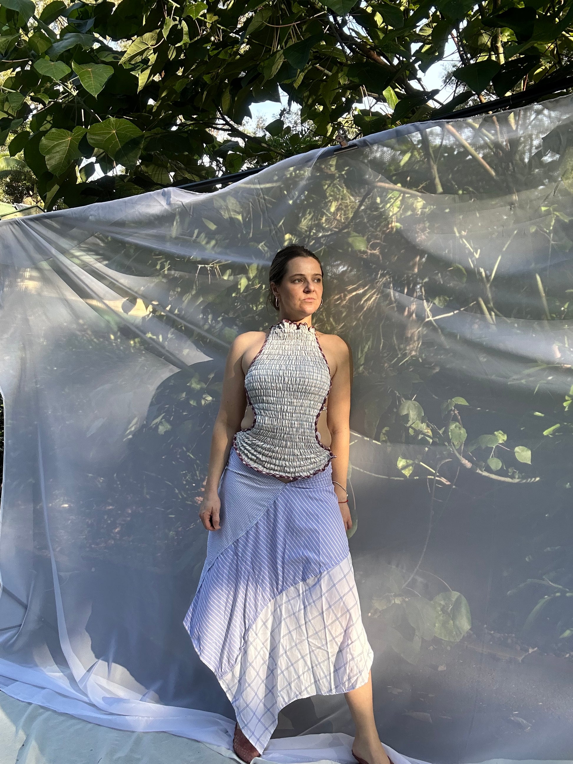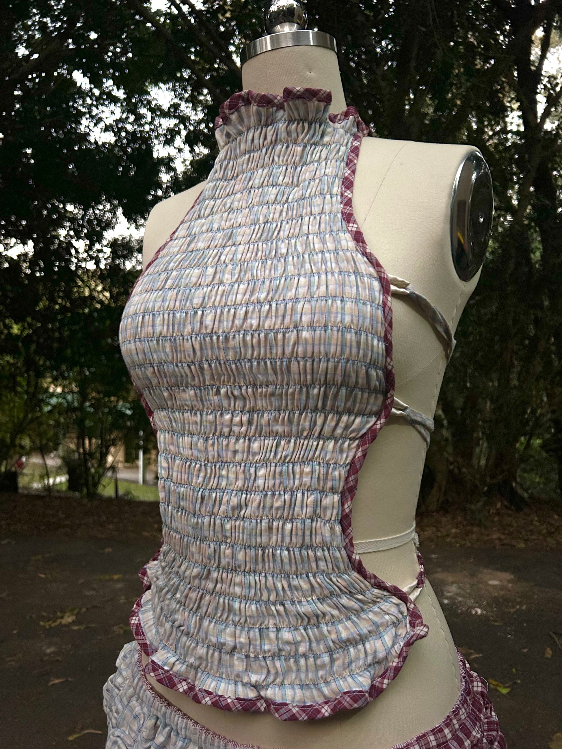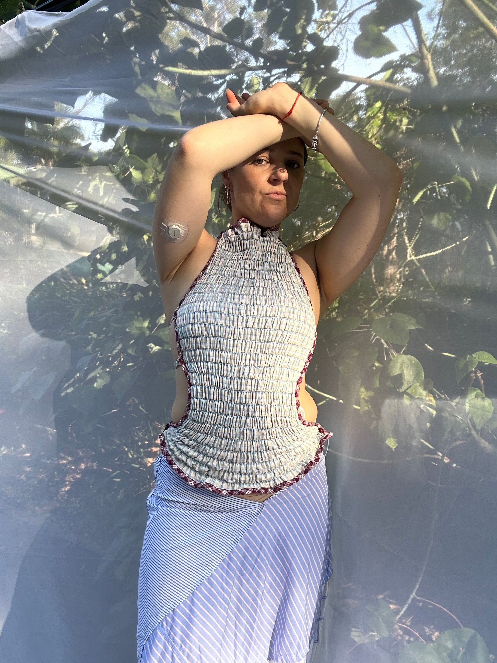 Upcycled reversible shirred halter top with adjustable ties across the back.