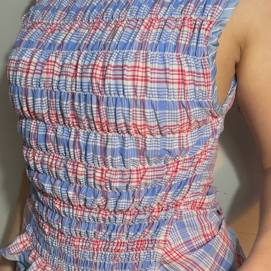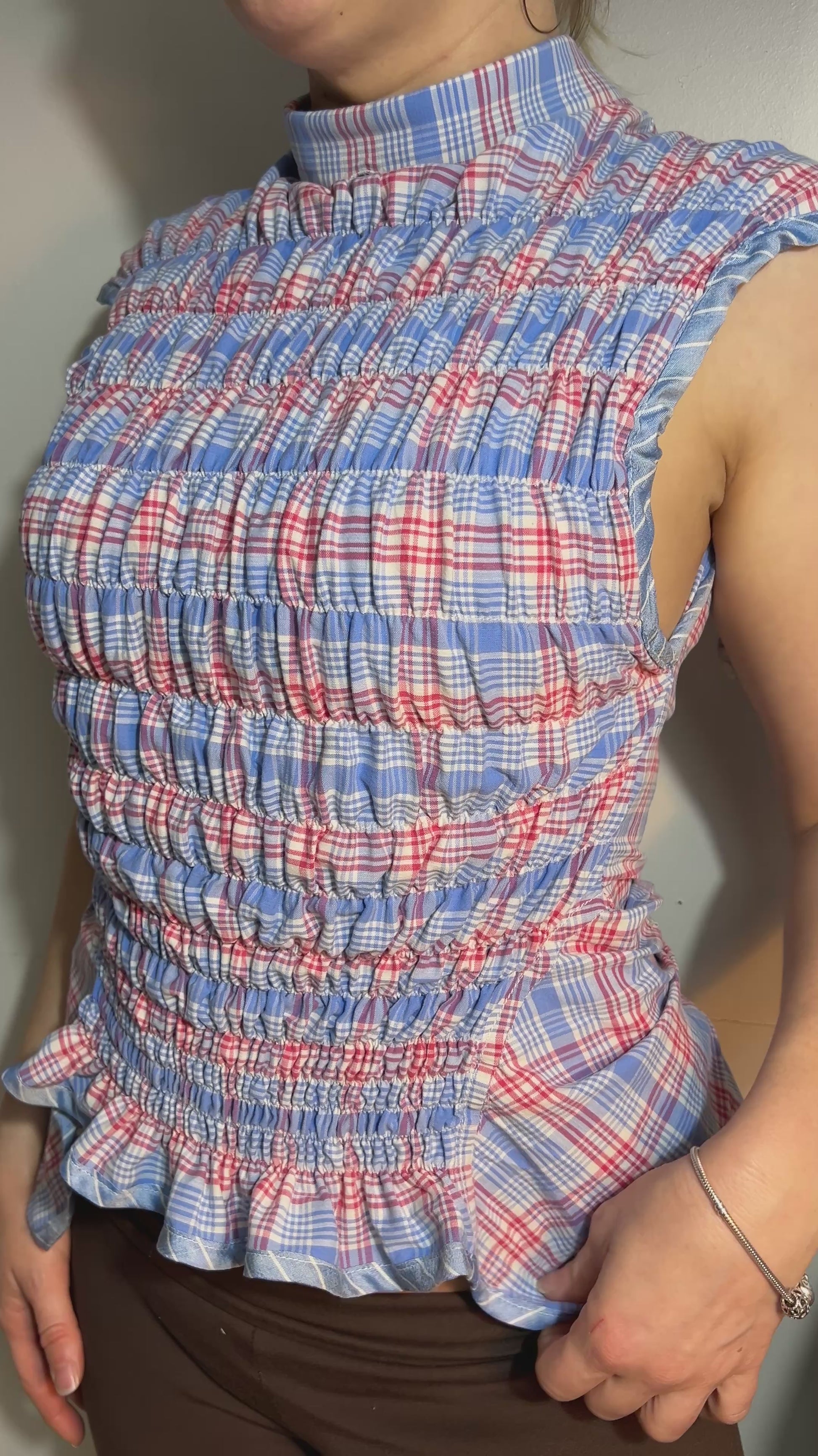 Upcycled plaid top with elastic shirring on one side and buttons on the other.